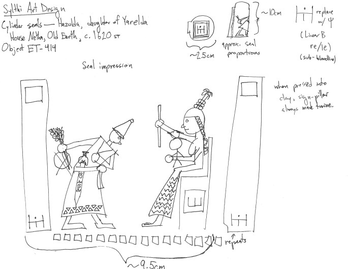 Scope bloat, on the other hand, I suspect is just something I’ll need to learn to handle by engaging with material. Idea bloat is more difficult for me, conceptually, to avoid because I find idea generation creatively fulfilling. Sketching out and outlining ideas I want to work on is refreshing when I’m in the bloodier stages of writing or editing a manuscript. It’s also a major way I engage with what I’m reading—for example, sketching a cylinder seal while reading about Near Eastern archaeology, or designing palaces or frescoes.