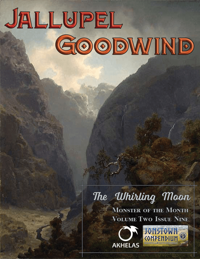 I really enjoyed working with Diana on this issue. The concept and bulk of the writing and design are hers—I only wrote the short description of Jallupel Goodwind’s grave site—while I edited, then put together the layout. I reached out to Diana a few months back, asking if she’d be interested in writing another issue because, c’mon, her ideas are horrifying and I love it. Among options in her idea drawer were a “moon tornado,” which ultimately became this issue’s tragic tale.