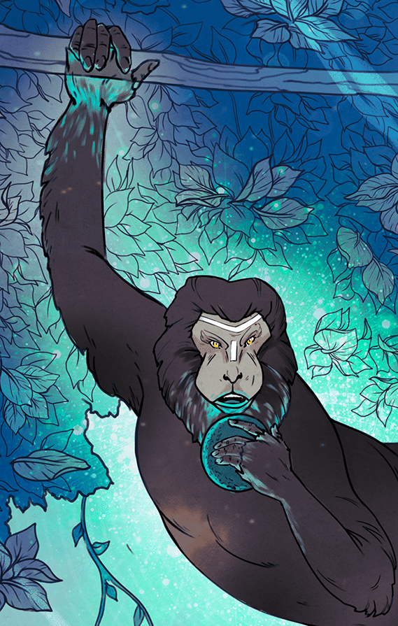The final result was the quite possibly over-complicated Cult of Hrunda, a monkey protector-god of the Old Woods. This entangled pleasantly with my in-development Esrolia material, because I tend to think of the Old Woods—which isn’t that far north of Sylthi—as a good “borderland” place for adventurers to go get into trouble. A capricious warden, Hrunda ended up keeping his Illusion affinity, but wandering away from the “knowledge god” aspect I’d initially considered. Part of this was because I wanted to develop Hrunda into MOTM’s final monster, as illustrated by Ludovic Chabant in the cover shown above. Another element is that I felt the cult and the god was becoming too much of a “does everything” deity.