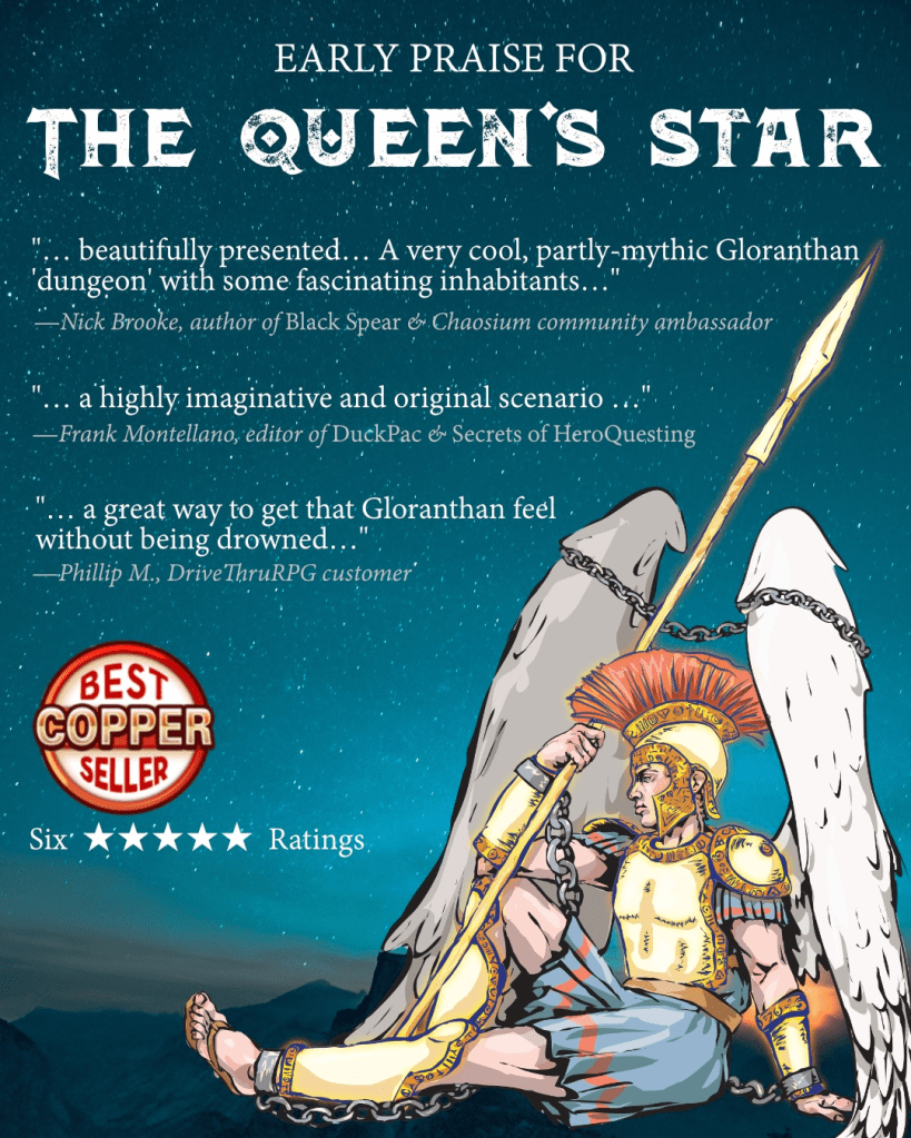 In related news, I released a new RuneQuest adventure last week! You can check it out here. The Queen’s Star has been doing well, and I’m delighted by the comments I’ve received from the community.
