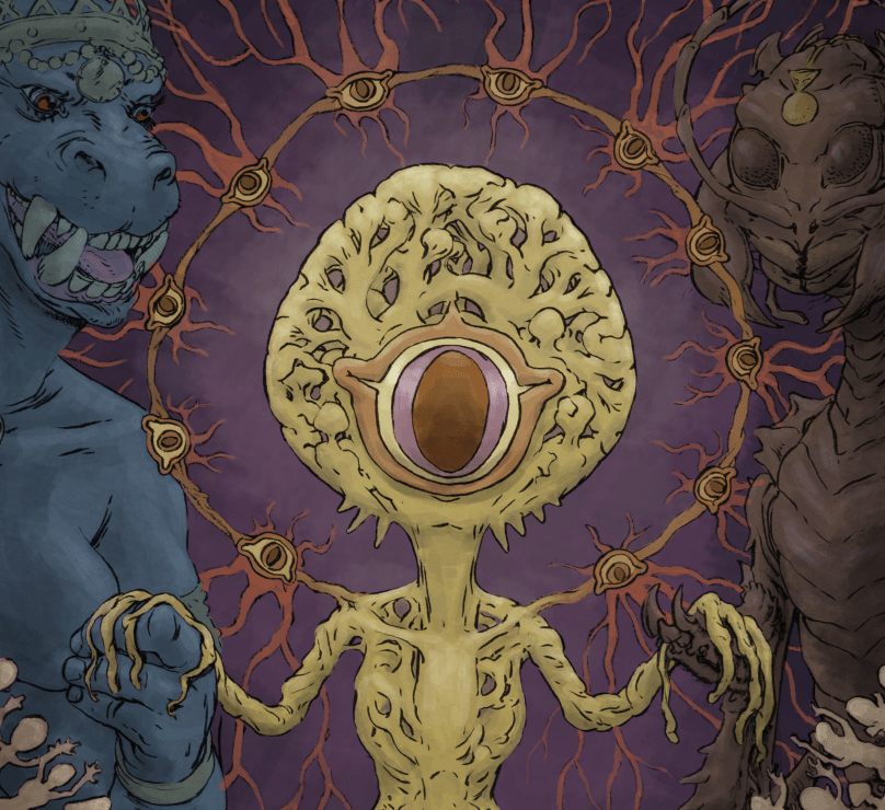 The Voralans is heavily illustrated with bespoke art by a number of frequent RuneQuest community members, such as Dario Corallo, Lee O’Connor, and Ludovic Chabant (of God Learner infamy). The art is routinely fascinating, weird as hell and I love it. Zombie mushrooms controlling corpses, the Queen of the Underworld on her fungal throne, and a shimmering shaman are some of the highlights. My favorite piece is probably the full-page illustration of the sisters Mee Vorala, Kyger Litor, and Sokazub (an insect goddess) in the mythology section.