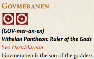 The Prosopaedia is an extensive reference work composed of short entries describing numerous gods, spirits, heroes, belief systems, and magical elements which are part of RuneQuest’s setting, Glorantha. These entries range from a few short sentences for obscure entities (like Gosarh), to about a full page of text for the most prominent (like Orlanth). Each generally begins by providing the entity’s Runes, a pronunciation guide, and the entity’s pantheon plus common titles. Some entries add red “see also” text. A typical entry’s text consists of three to five paragraphs with a focus on an entity’s mythic feats and relationships, then relationships within time, and finally iconography. In a few cases this last is weighted quite heavily—throughout I felt that The Prosopaedia was not just saying “this is what the gods are about,” but also “this is what the gods look like.”