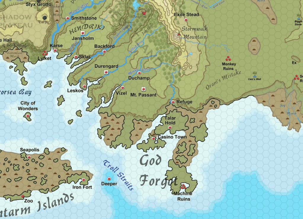 In RuneQuest: Roleplaying in Glorantha (RQG) the core “game area” extends north to Tarsh, and south to Choralinthor Bay, centered on the princedom of Sartar. The former “Holy Country” which surrounded the bay has split back up into six regions following the disappearance of its magical ruler, Belintar. RQG more or less provides rules for playing adventurers from two of these Homelands: Esrolia and Heortland. (Heortland isn’t strictly described as its own Homeland, but since it’s included as a region of Sartar in RQG I believe that’s how Chaosium’s Glorantha views it.) Of those not yet detailed, the region of God Forgot is a sorcery-dominated culture. This is so far south it’s not actually on the RQG maps—you need to check out the Guide to Glorantha or the free Argan Argar Atlas to actually go that far south.