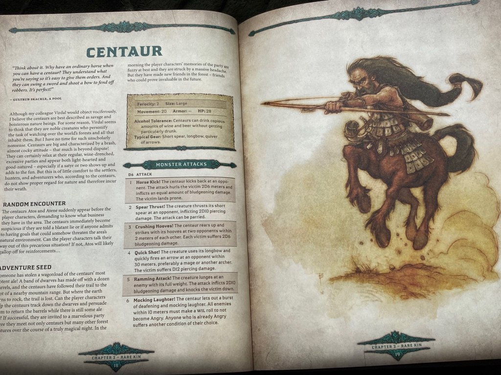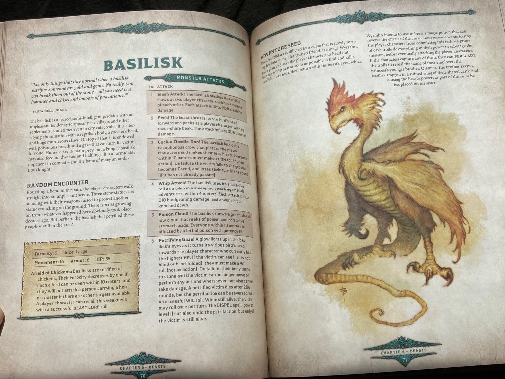 In contrast, one reason I love the Book of Beasts is its abundance of useful content and interesting ideas. For example, each entry has a “Resources” section which describes what adventurers might harvest from the monster. The inclusion of Lore rolls increases the detail about each entry, and it feels that there’s just plain more text on each page.